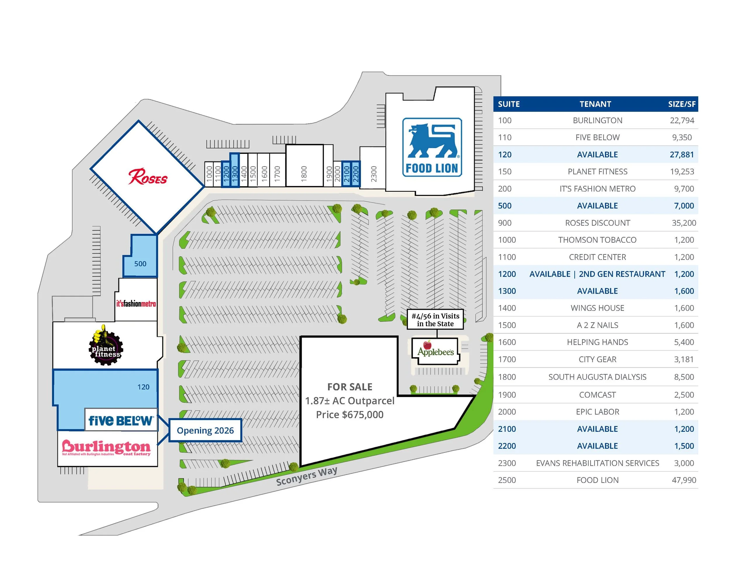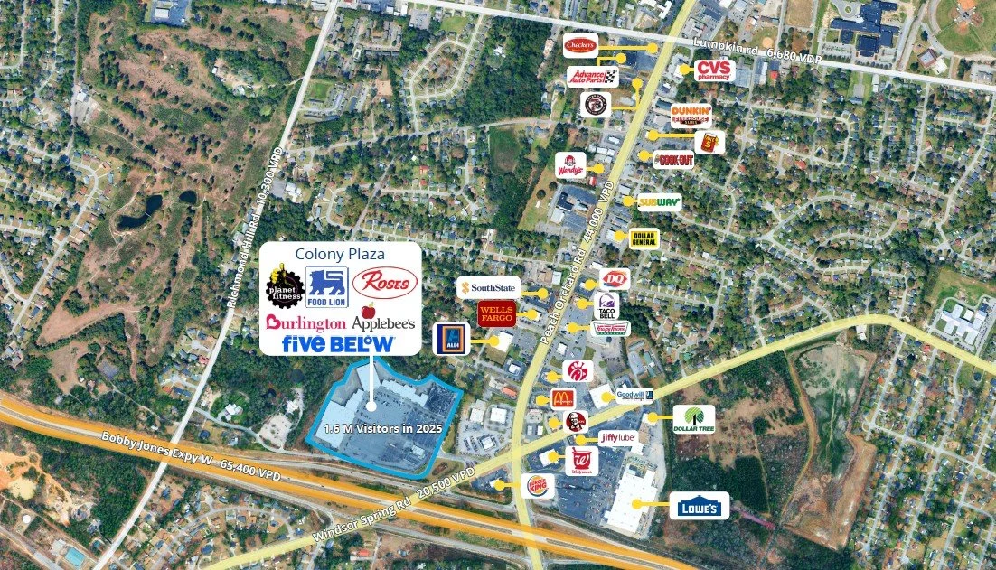 PRIMARY ATTRIBUTES: Colony is located in South Augusta at the corner of Windsor Spring Road and Peach Orchard Road. It is highly visible from I-520 (Bobby Jones Expressway), which has a daily traffic count of ~65,000. The center offers a well-diversified mix of retailers including Food Lion (anchor), Planet Fitness, Rose’s, Hibbett Sporting Goods, and Applebee’s (outparcel). There are two outparcel opportunities, as well as billboard space, currently available.