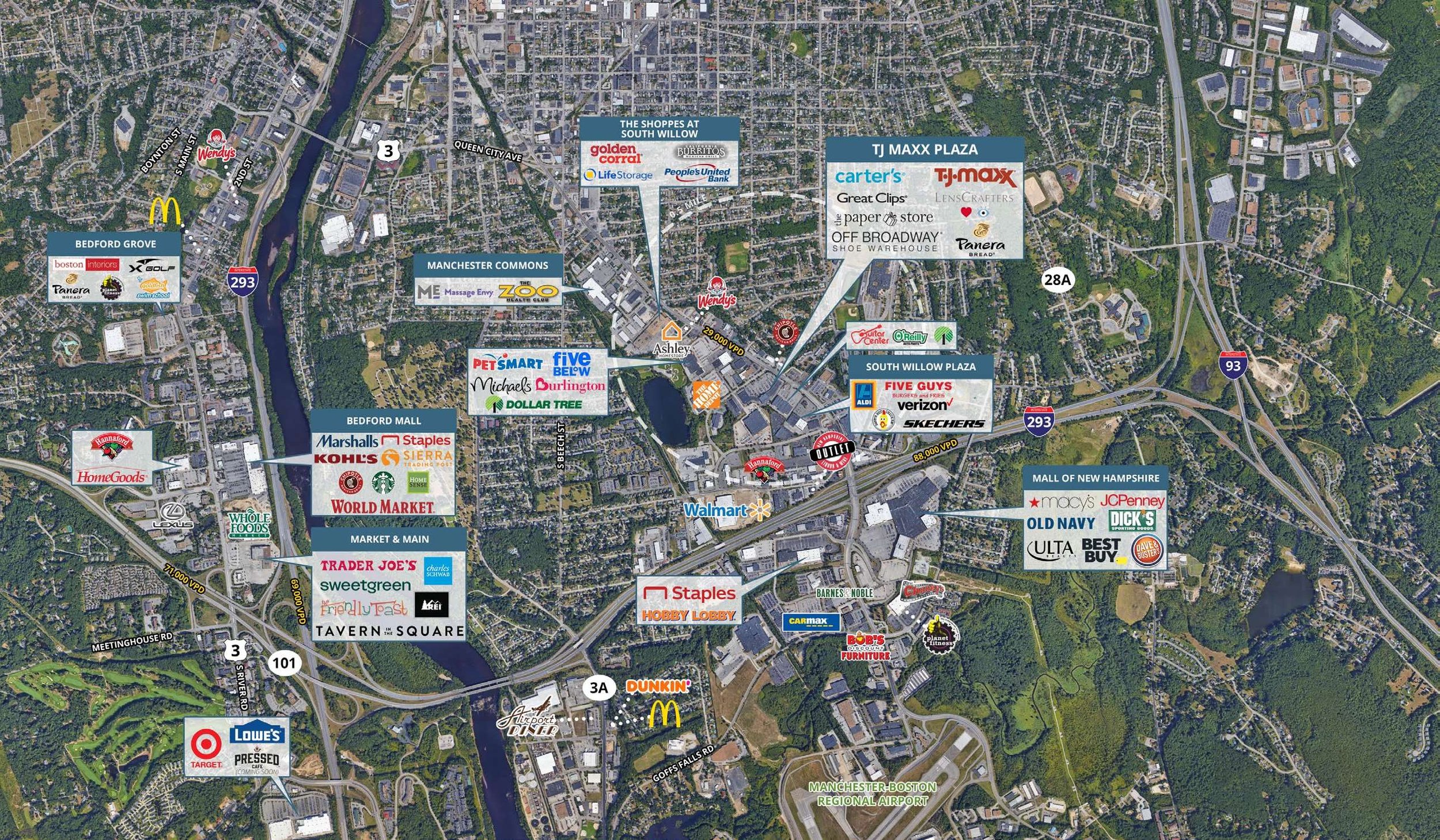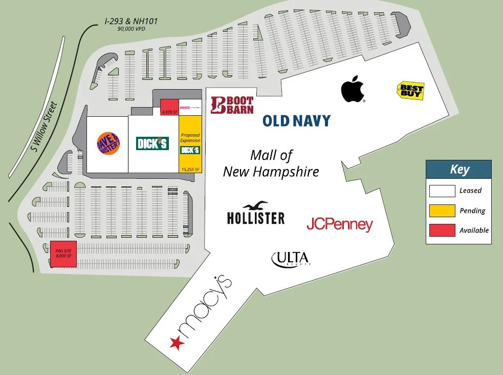 PRIMARY ATTRIBUTES: Redevelopment of the former Sears shadow-anchored by the Mall of New Hampshire, an 800,000± SF, high volume mall anchored by Macy’s, JCPenney, Best Buy, Old Navy and Ulta. The site is anchored by strong national retailers Dick’s Sporting Goods and Dave & Buster’s, and sits at the crossroads of I-93 (49,481 VPD) and 293 (88,000 VPD), providing regional access throughout the state. The site is centrally positioned in a dense retail corridor with nearby retailers including Walmart, Home Depot, Burlington, TJ Maxx, BJ’s Wholesale and Aldi.